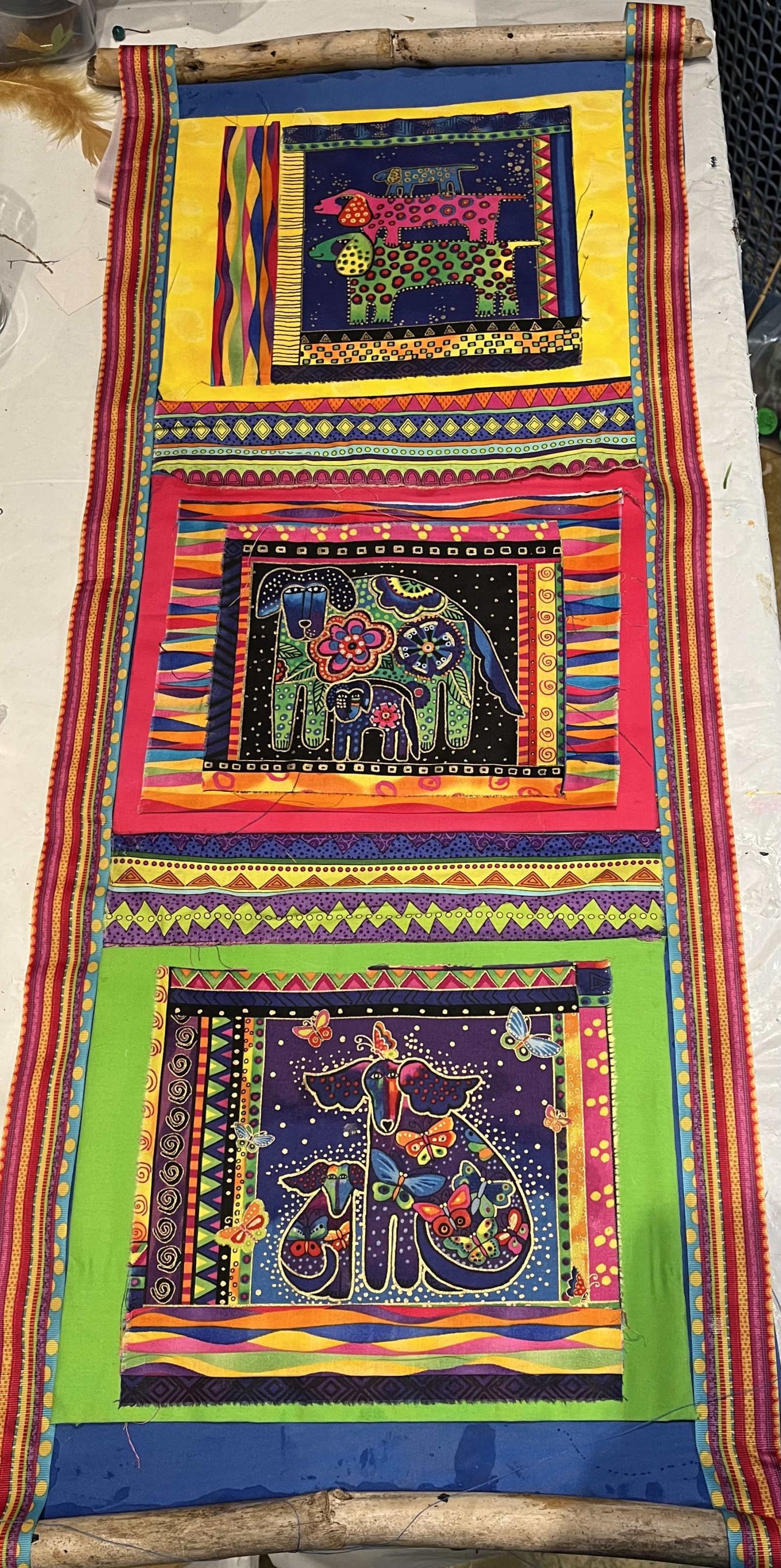 This textile wall hanging is made from designer fabric and ribbon. It's 16" x 32 and is ready to be hung. Perfect for DOG LOVERS!
