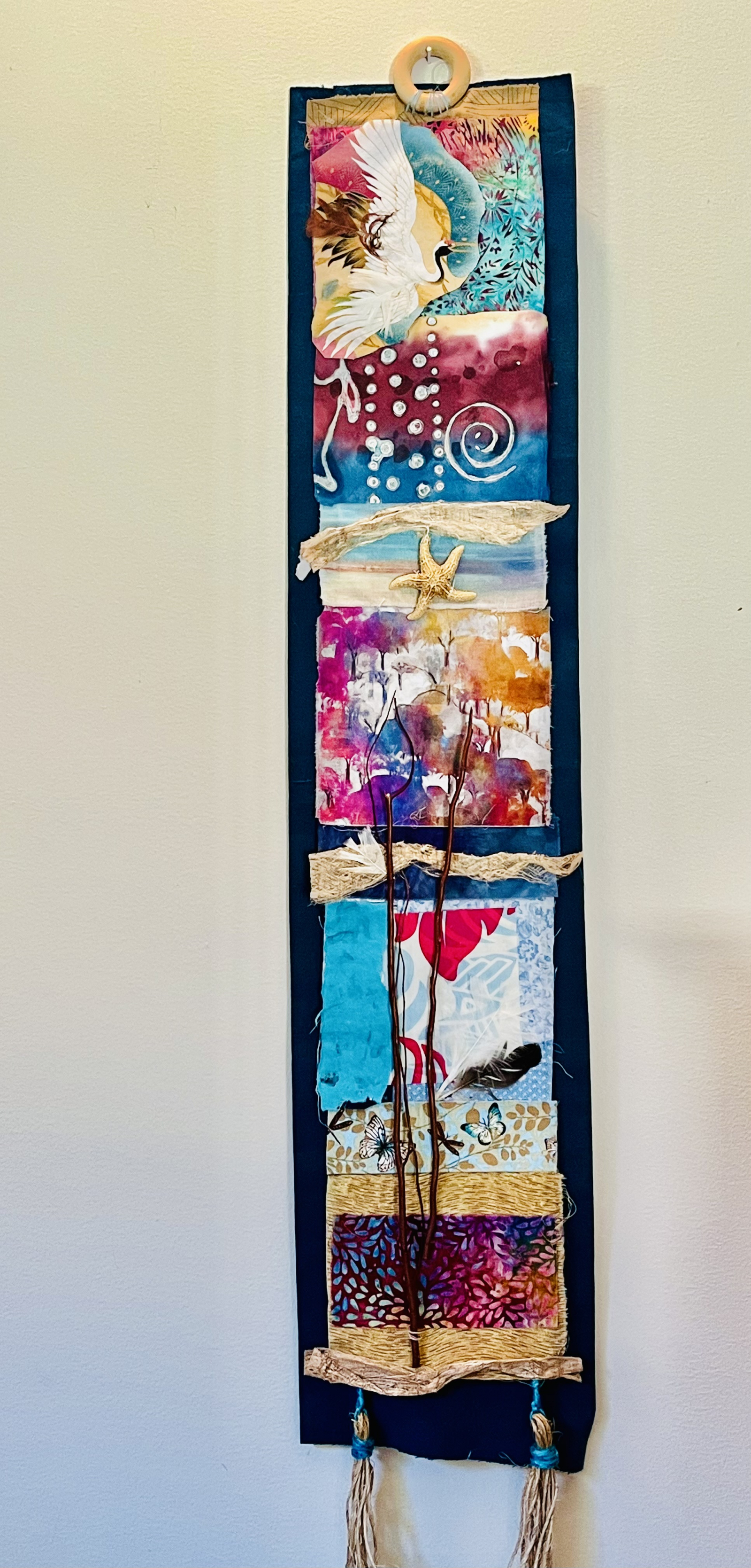 This is a mixed media piece made with designer fabric, paper and ephemera. The colors and design are soothing and peaceful. It speaks of nature, the ocean and the sky. Its sure to soothe your soul! Hand stitching and ready to hang! 38"L x 9"w